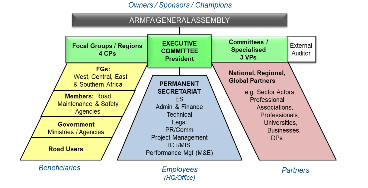ARMFA-AFERA operates through a meticulously defined governance and operational structure, supported by a diverse and committed network of stakeholders dedicated to its mission of enhancing African road maintenance funds and road infrastructure development. The General Assembly (GA) stands as the supreme governing body of ARMFA-AFERA, comprising all Road Maintenance Funds that are members of the Association. The GA holds the ultimate authority to deliberate and make decisions on all matters concerning the governance, strategic direction, and operational aspects of ARMFA-AFERA, ensuring alignment with the overarching goals of sustainable road asset management across Africa.